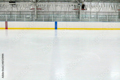 Naklejka premium View across the empty ice of an indoor hockey rink with metal bleachers