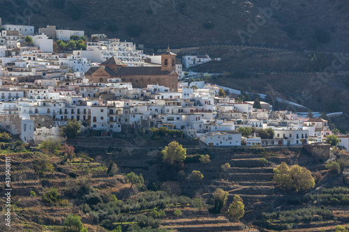 Naklejka premium View across white village on the slope of mountain in the Sierra Nevada, Las Alpujarras, Granada Province, Spain