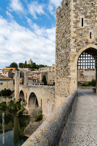 Fototapeta premium View along romanesque bridge over the Fluvia river, arches and defence towers...