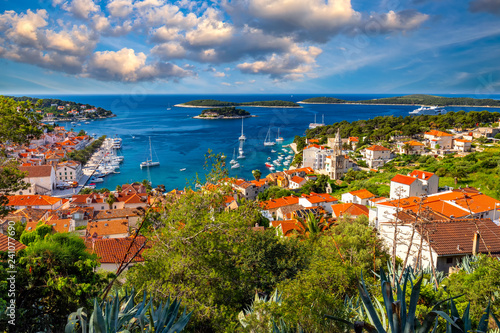 © daliu, Fototapeta premium View at amazing archipelago in front of town Hvar, Croatia. Harbor of old Adriatic island town Hvar. Popular touristic destination of Croatia. Amazing Hvar city on Hvar island, Croatia.