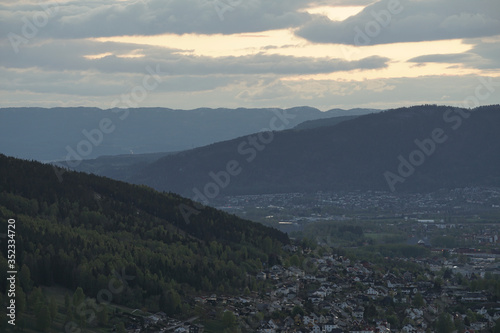 © oleksandr, Fototapeta premium View at city cituated in a valley between mountains in evening time.