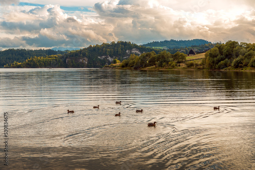 Naklejka premium View at Czorsztynskie Lake in the evening sun. Rocky hills covered with forest on the other side of the lake. A flock of ducks floating on the water surface.