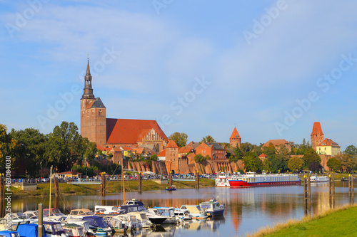 Naklejka premium View at the port of Tangermuende and the historical old town with city wall,...