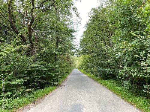 Fototapeta premium View down, Hole House Lane, lined with trees in, Easington, Clitheroe, UK