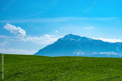 Fototapeta premium View from a green field towards mount Rigi, a famous mountain in Switzerland,...