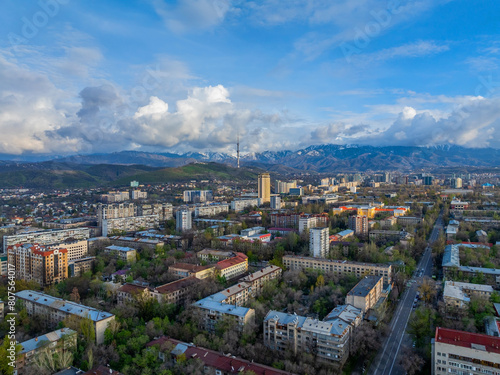 © Max Zolotukhin, Fototapeta premium View from a quadcopter of the central part of the Kazakh city of Almaty on a spring evening