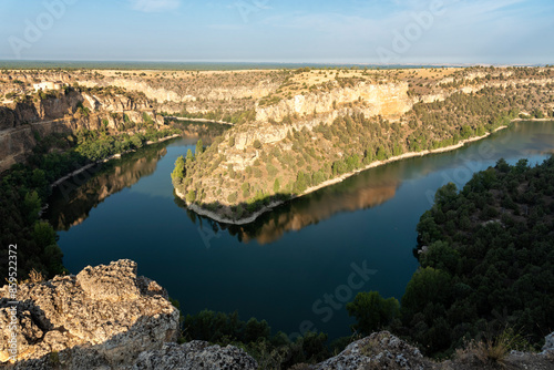 Obraz premium View from a rocky shoreline on a cliff of the Duraton river running through a beautiful sickle at sunrise, Duraton River Sickles Natural Park at sunrise, Sepulveda, Segovia, Spain