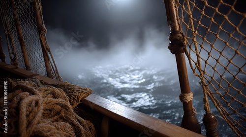 © Bussakon, Obraz premium View from a ship s deck at night during a storm with rough seas mist and moonlight illuminating the water