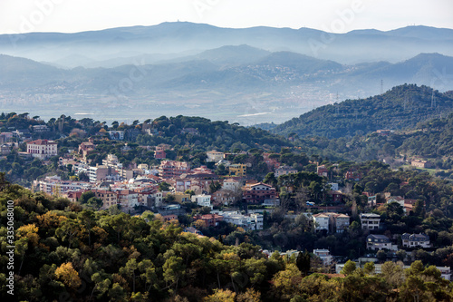 © Tanya Keisha, Fototapeta premium View from above on small town in the evening fog among the wooded hills of the Pyrenees mountains, Spain