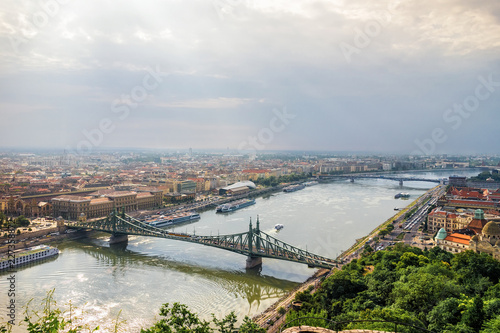 Obraz premium View from above on the Budapest city, historical district and Danube river in...