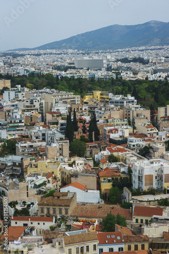 © Evgenii Starkov, Fototapeta premium View from above on the streets and roofs of the houses of a modern European city. Athens summer day from a height.