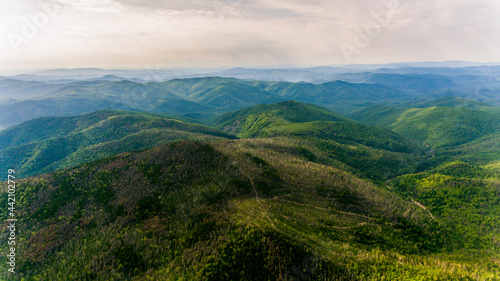 Naklejka premium View from above. Russian green taiga. Green ridge of a high mountain,...
