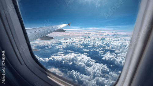 © Tahsin, Obraz premium View from airplane window showing wing and clouds against a blue sky background