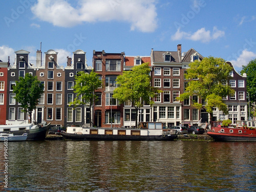 Fototapeta premium View from Amstel, Amsterdam canal, towards dutch houses