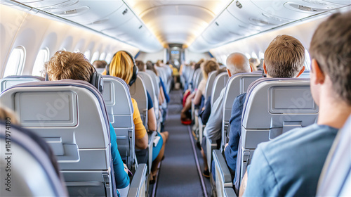 Fototapeta premium View from an airplane cabin showing rows of occupied seats, emphasizing...