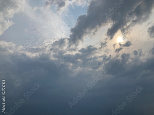 Fototapeta premium View from an elevated perspective of a cloudy, stormy sky with sunlight...