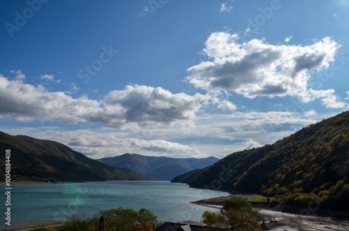 Naklejka premium View from Ananuri Fortress Complex to tranquil vibrant turquoise water...