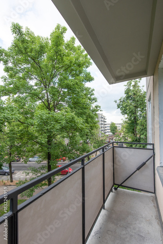 © Mindaugas Dulinskas, Obraz premium View From Balcony Overlooking Green Trees and Residential Area