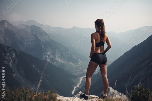 © Kowit, Obraz premium view from behind fitness girl standing on top of the mountain. woman in sportswear standing on the mountain. Generative Ai.