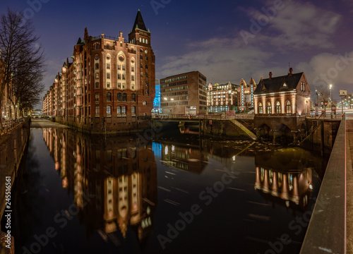 Obraz premium View from Bei St. Annen over the Holländischbrookfleet at night in Hamburg Speicherstadt