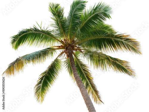 © anwar, Fototapeta premium View from below of a tall palm tree with lush green fronds against a clear sky.