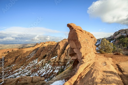 Fototapeta premium View from Black Arch Overlook, vantage point, sandstone cliffs in winter, Devil's Garden Trail, Arches National Park, Utah, USA, North America