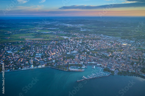 © Berg, Fototapeta premium View from city of Desenzano del Garda, Italy, on sunny summer day. Natural background. Drone view of Desenzano del Garda. Aerial view. Beautiful Garda Lake with lighthouse (Lago di Garda).