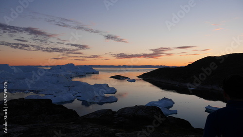 © robb, Fototapeta premium View from cliff overlooking bay of icebergs in Greenland