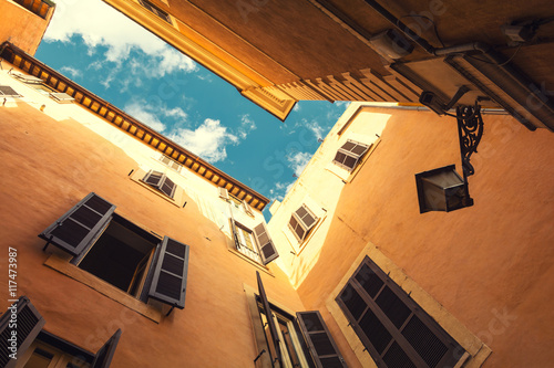 © lukaszimilena, Fototapeta premium view from corner street in Rome to sunny sky