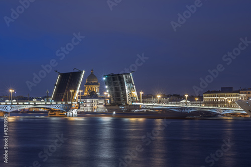 © Evgeny Korshenkov, Fototapeta premium View from embankment to the opened Blagoveshchensky bridge and Saint Isaac's Cathedral behind it.