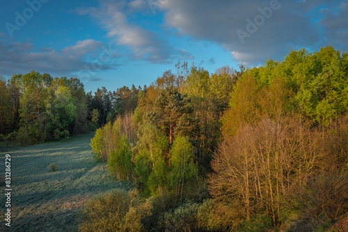 © luzkovyvagon.cz, Naklejka premium View from fast train to Brno near Ceske Budejovice with morning frosty forests