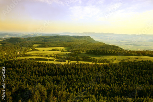 © fotokate, Fototapeta premium View from Great Szczeliniec, Szczeliniec Wielki highest peak of Stolowe Mountains to small, historic village of Pasterke and Czech part of Table Mountains with Koruna and Bozanovski Spicak peak Poland