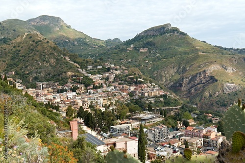 Naklejka premium View from Greek Theatre on Taormina city on Sicily island. Italy. Europe. 9th May 2025.
