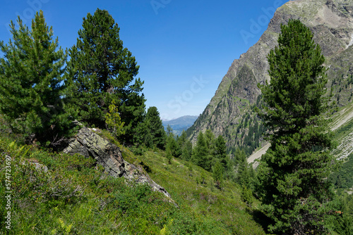 © Oliver Dünser, Obraz premium View from high in the mountains towards summits and forest into the blue sky