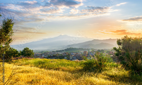 © Yaroslav, Obraz premium view from hill with golden grass and green bushes to a valley town with majectic mountains and scenic cloudy sunset on background