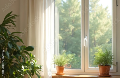 © Viktor, Fototapeta premium View from home window to sunny green forest. Potted plants on windowsill. Interior design element. Modern apartment living room with transparent window. Sunlight. Home gardening, eco-friendly,