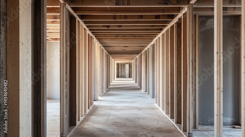Fototapeta premium View from inside a home under construction looking through open wall frames, no people