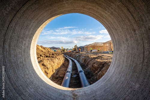 © Meow Creations, Fototapeta premium View from inside a large concrete pipe looking out at a construction trench with pipelines