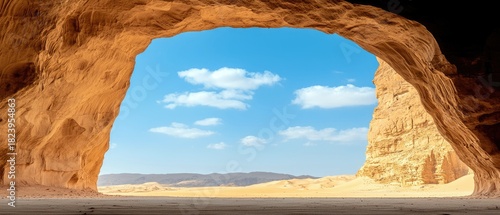 © Jjj, Fototapeta premium View from inside a natural rock cave looking out to a vast desert landscape under a bright blue sky with scattered white clouds. The rock formations are golden