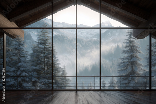 Naklejka premium View from inside an alpine chalet through a large glass wall showing snowy pines and misty mountains, soft reflections on the glass