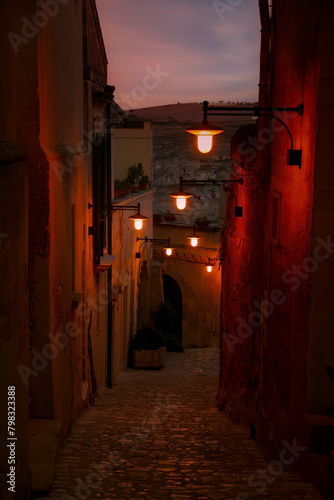 Obraz premium View from lamplit alleyway in Matera, Italy