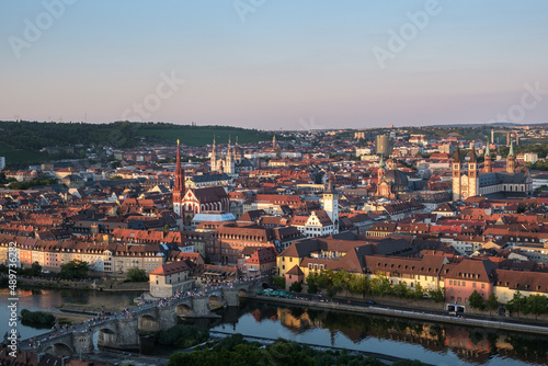 © Christian, Fototapeta premium View from Marienberg Fortress with sunset over the river Main and the streets from Würzburg in Germany.