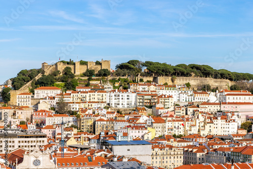 Fototapeta premium View from Miradouro de Sao Pedro de Alcantara of the the Baixa district with Castelo Sao Jorge (St Georges Castle) in the distance, Lisbon, Portugal.