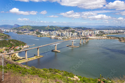 © Renata Sattler, Fototapeta premium View from "Morro do Moreno" in Vila Velha city to Vitoria City, Vitoria Bay and blue sky