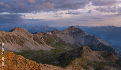 © Simona, Fototapeta premium View from Parpaner Rothorn in the Swiss alps on a late summer day