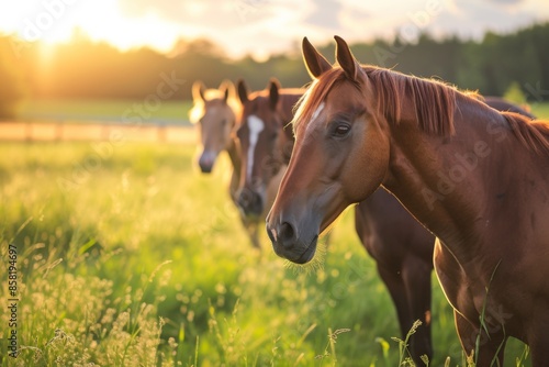 © Eyestetix Studio, Obraz premium View from side body of a three Thoroughbred Horse standing on grass, Awe-inspiring, Full body shot ::2 Side Angle View