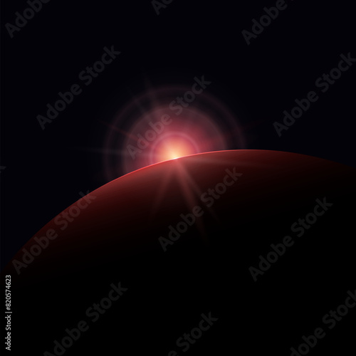 Obraz premium View from space, red star rises above the planet, the sun rising over the earth, rays and glare over the earth , space background, vector illustration