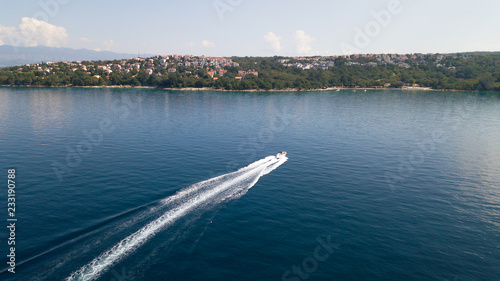 © Oleksii Nykonchuk, Obraz premium View from the air - powerboat sails to the sea