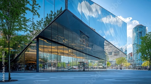 © Sajeel, Obraz premium view from the bottom of a contemporary, geometric, glass building with a distinctive style and futuristic architecture ---694ddd8b5f9b