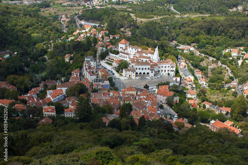 © Daniil, Fototapeta premium View from the fortress wall of the castle of the Moors. View of the small town of Sintra near Lisbon. Top view of a cozy village with red roofs in the middle of a green valley and forest.